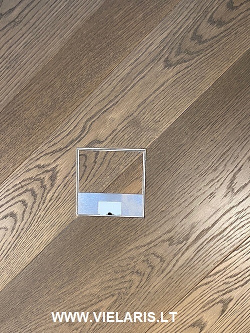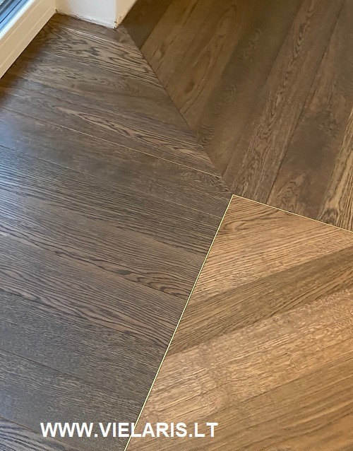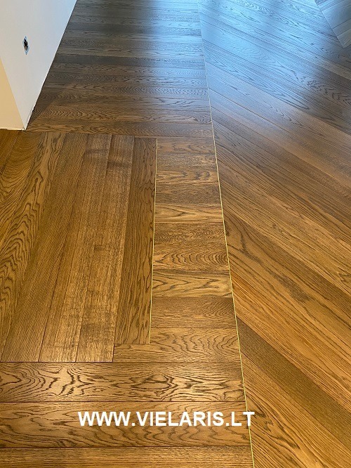 Apartment in Vilnius featuring French herringbone flooring in varying widths. The oak is stained and oiled, with a 4+12 birch plywood construction, dimensions 90/150 x 250 x 1500 mm.