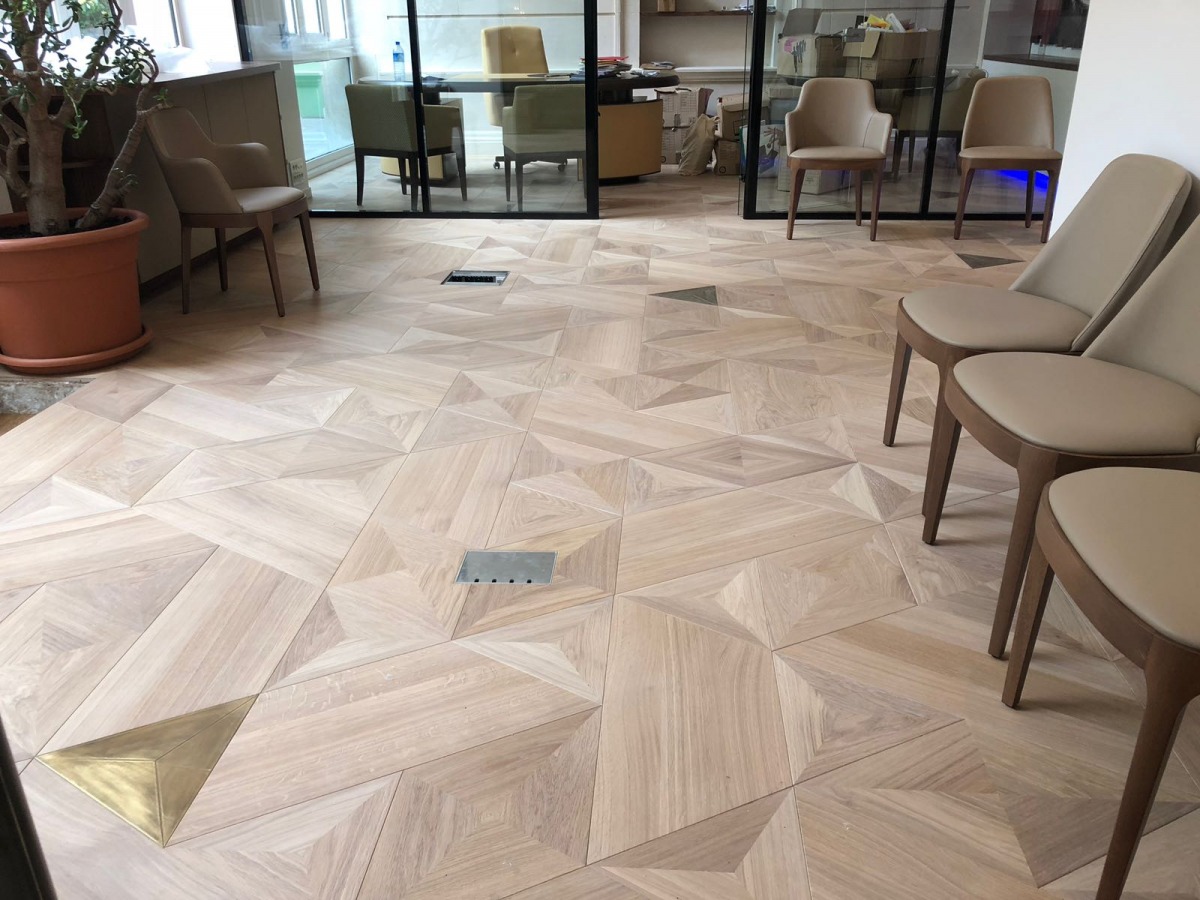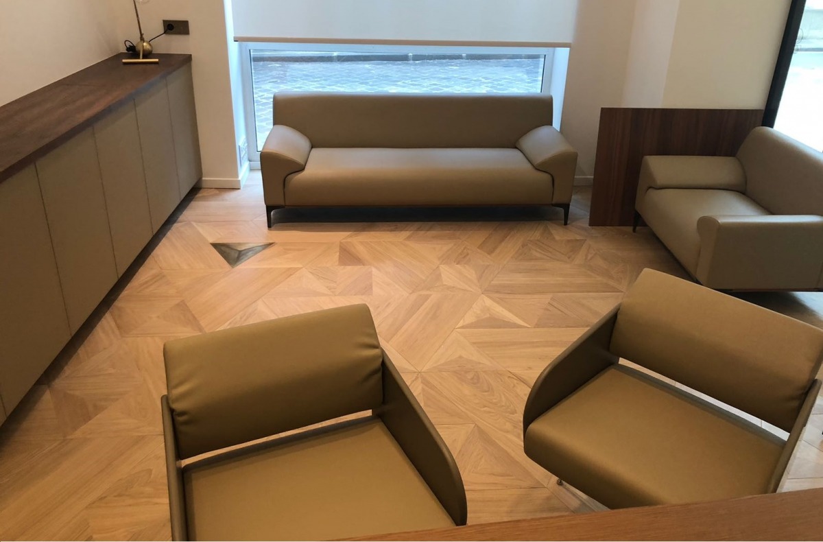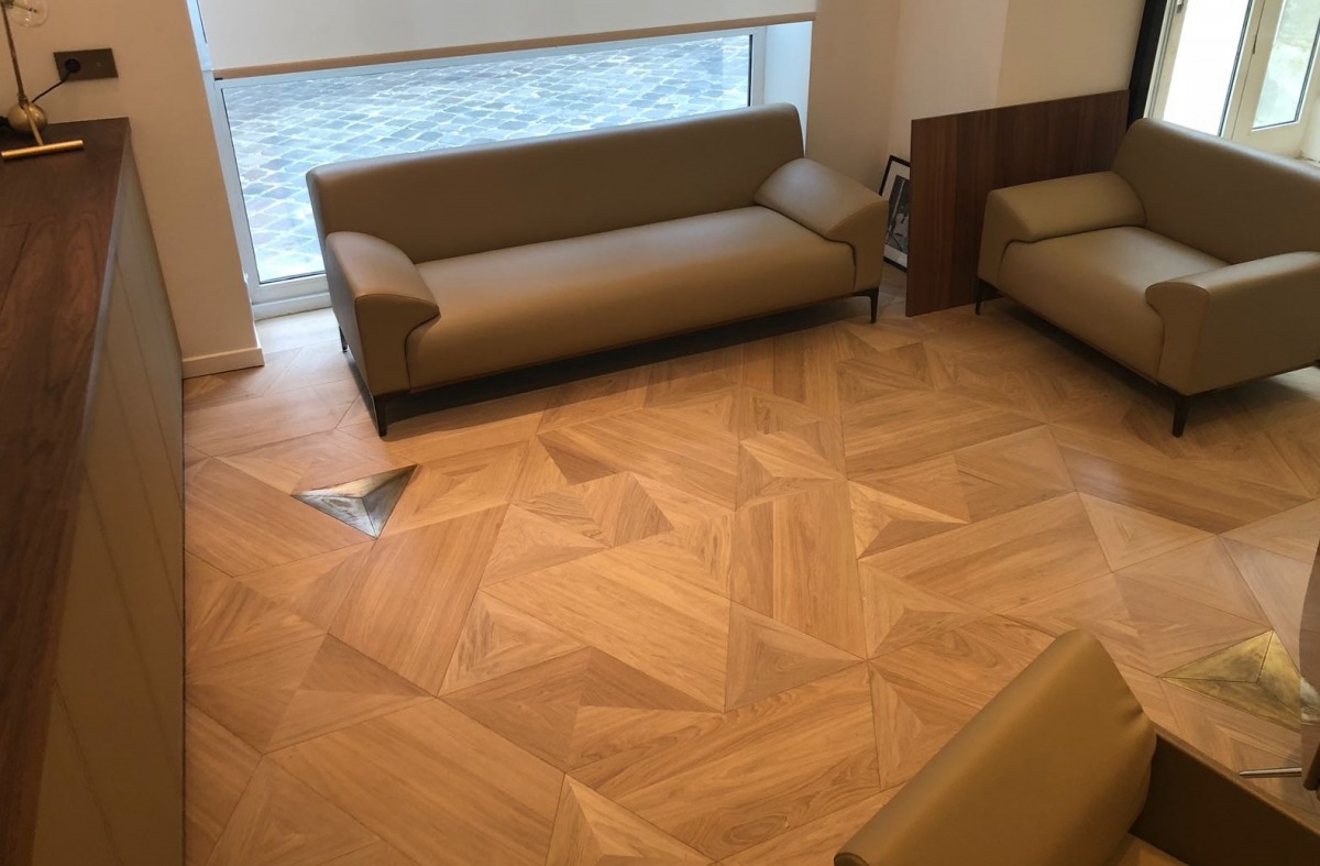 Office on the Champs-Elysees, Paris. Trio design panels installed with brass metal triangular elements.